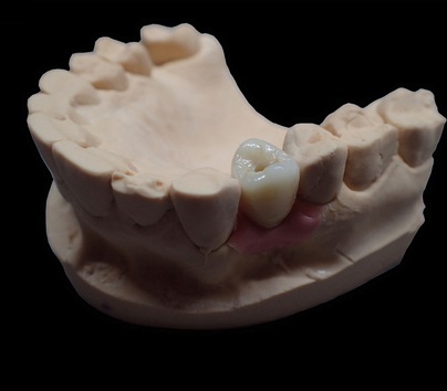 Pacjent po utracie zęba 14 został zaopatrzony w implant blue sky (bredent). W okresie osteointegracji za pomocą korony tymczasowej kształtowany był jednocześnie profil wyłaniania korony. Lekarz zdecydował o wykonaniu ostatecznego uzupełnienia w postaci przykręcanej korony hybrydowej. W jej skład wchodzą tytanowy T-base oraz wklejana cyrkonowa podbudowa licowana ceramiką w części koronowej.