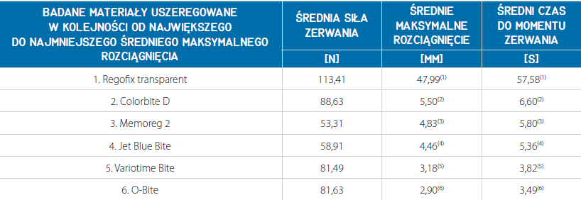 Podsumowując, należy stwierdzić, że najlepsze parametry ma materiał Regofix transparent: ze średnią siłą zerwania 113,41 N; średnim maksymalnym rozciągnięciem 65,99 mm oraz średnim czasem do momentu zerwania wynoszącym 57,58 s. Jeżeli chodzi o średnią siłę zrywania, to najsłabszym parametrem charakteryzuje się materiał Memoreg 2 (53,31 N). Natomiast najmniejszą średnią maksymalnego rozciągnięcia wynoszącą 2,90 mm oraz najkrótszym średnim czasem do momentu zerwania 3,49 s charakteryzuje się materiał O-Bite (tab. 7, 8).