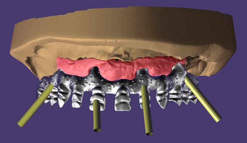 Około 60-letni pacjent zgłosił się do gabinetu lekarza dentysty z protezą całkowitą szczęki górnej, z estetycznym i funkcjonalnym dyskomfortem. Pacjent oczekiwał możliwości przeprowadzenia rehabilitacji, która przywróci prawidłową funkcję zębów i estetyczny uśmiech. Analiza przeprowadzona za pomocą CBCT pozwoliła określić, w jaki sposób struktury kostne pozwolą przygotować i przeprowadzić plan leczenia przy pomocy implantów. Wprowadzono 4 implanty, z których 2 zostały umieszczone w górnym obszarze przednim, a 2 – wychylone odśrodkowo w górnym obszarze przedtrzonowym.